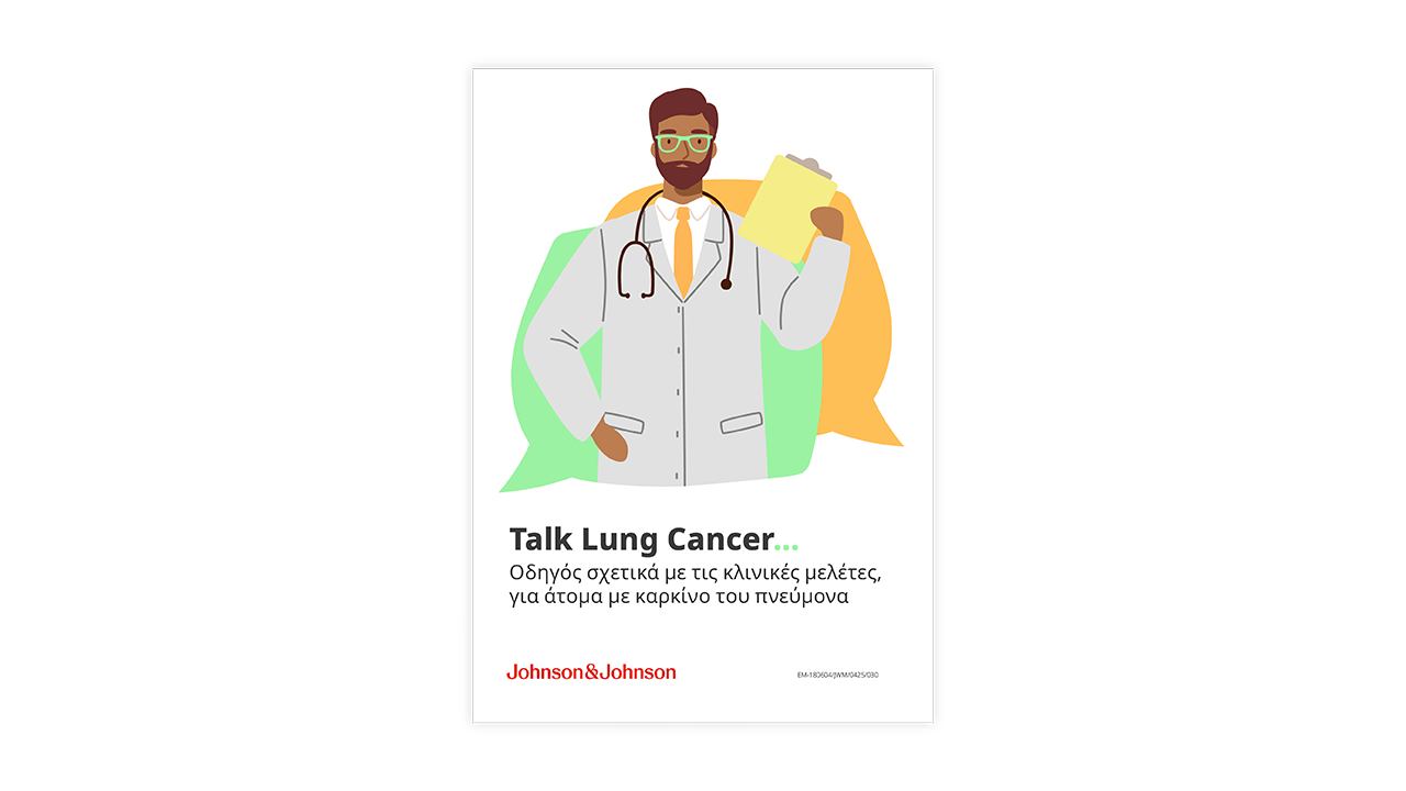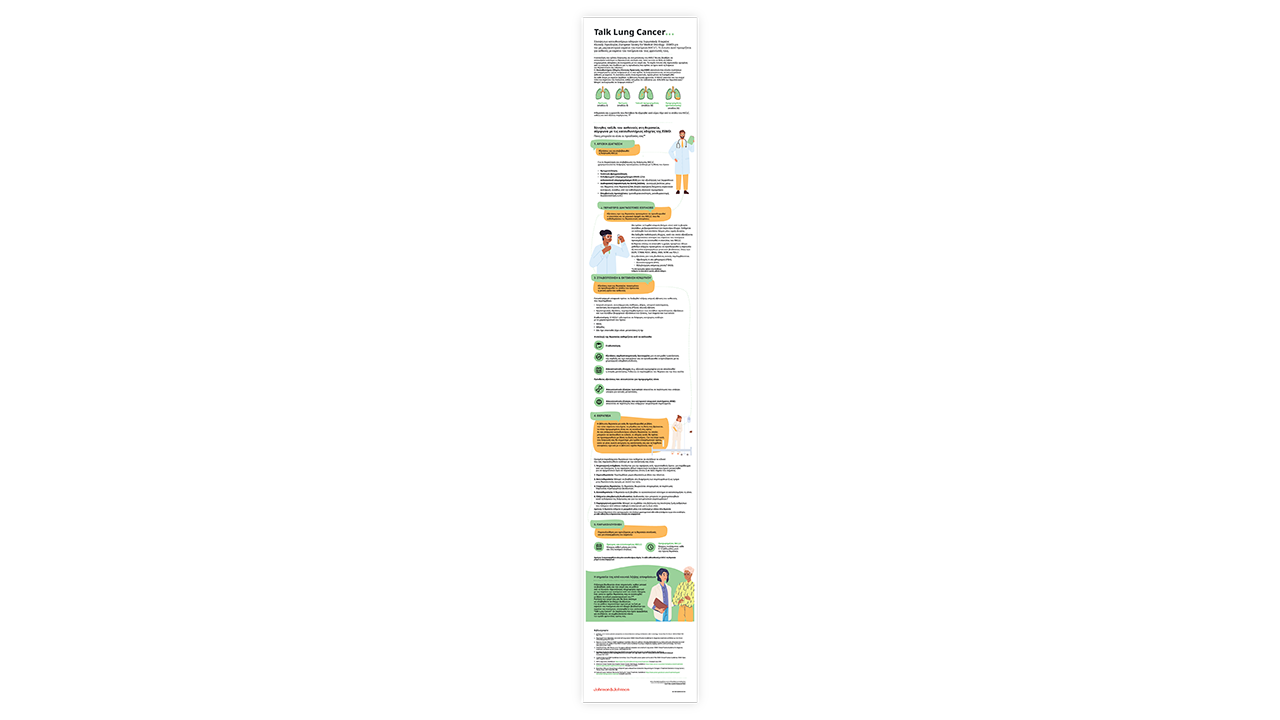 Το ενημερωτικό υλικό του ‘Talk Lung Cancer’ αναπτύχθηκε με τη συνεργασία μελών της κοινότητας ασθενών με καρκίνο του πνεύμονα και επαγγελματιών υγείας. Στόχος του υλικού αυτού είναι να διαλύσει τις αμφιβολίες σας και να διασαφηνίσει ένα πλήθος σημαντικών ζητημάτων.