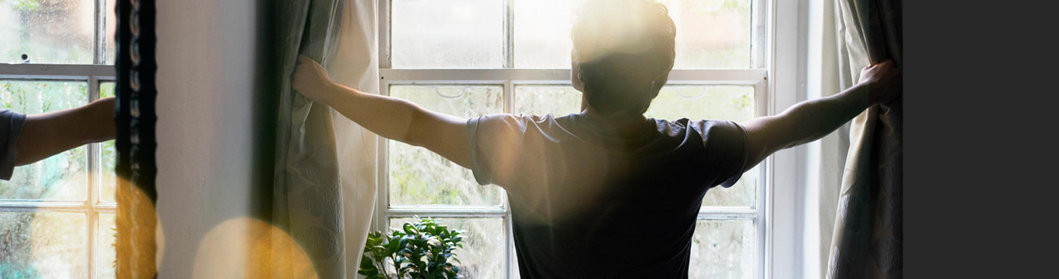 Μια κοπέλα με σκουφάκι κοιτάζει έξω από το παράθυρο